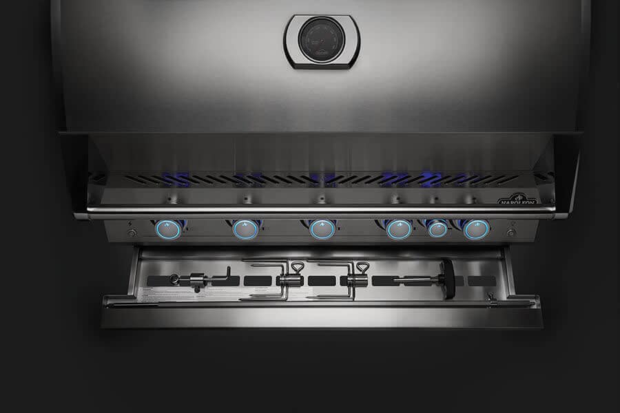 Con 630 pollici quadrati di superficie di cottura principale (90 x 46 cm) più la griglia scalda-vivande, il Napoleon Barbecue da incasso 700 Series 38 offre spazio abbondante per cucinare per tutta la famiglia e gli amici senza compromessi. I 5 bruciatori principali in acciaio inossidabile garantiscono un controllo del calore incredibilmente preciso su ogni zona di cottura, mentre il bruciatore infrarossi posteriore trasforma questo grill in una rotisserie professionale – il kit girarrosto commercial-grade è già incluso e si ripone comodamente nello storage integrato sotto il barbecue.