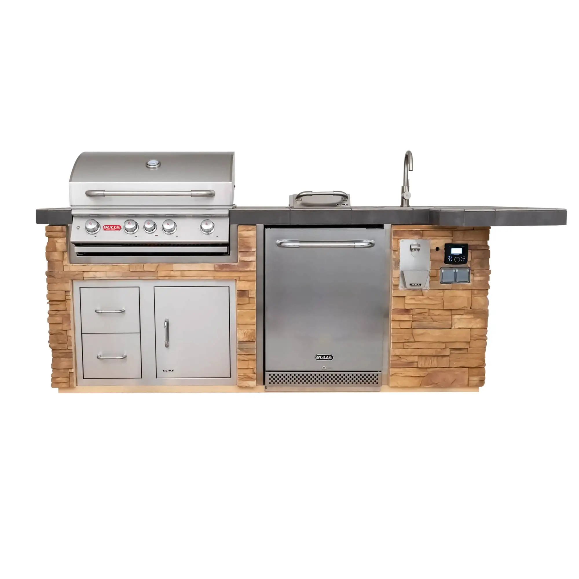 Le cucine da esterno Bull ora vengono fornite con un kit di strumenti per la cura e la manutenzione. Vengono inoltre fornite complete di una copertura invernale su misura Sunbrella Surlast montata, materiali per la pulizia e il ripristino. Il prezzo include anche il precablaggio, il sifone per scarichi, tutti i collegamenti del gas per le apparecchiature GPL e le spese di imballo.