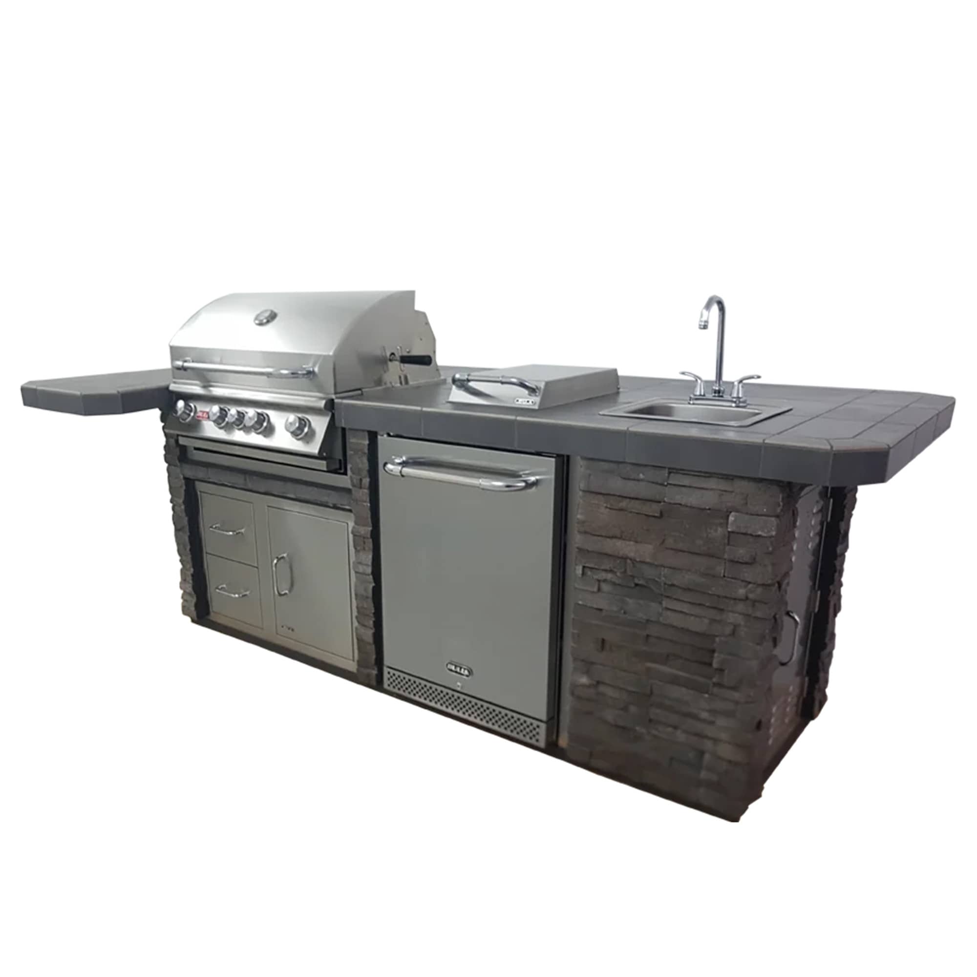 Dotata di serie di un frigorifero in acciaio inossidabile da 4.5 cu. ft., griglia Angus a 4 fuochi, lavello con rubinetto in acciaio inox, porta in acciaio inox e presa elettrica da 230V, questa cucina è perfetta per ogni esigenza di intrattenimento. Il piano di lavoro in piastrelle con profondità di 1086mm ti offre spazio abbondante per cucinare e preparare i tuoi piatti.