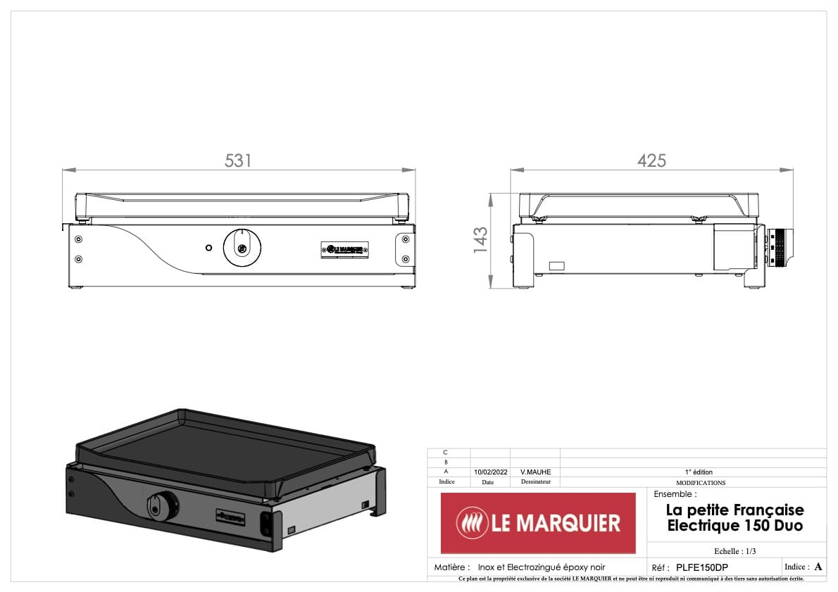 Il modello della Piastra Liscia Elettrica la Petite Francaise 150 si distingue per il suo telaio innovativo in doppio materiale: una combinazione di acciaio inox e acciaio elettrozincato in colore nero, che ne esalta l’eleganza e la resistenza. La pratica vaschetta raccogli-gocce in acciaio inox rettangolare laterale è incorporata per una protezione extra, mantenendo pulito l’ambiente durante l’uso.