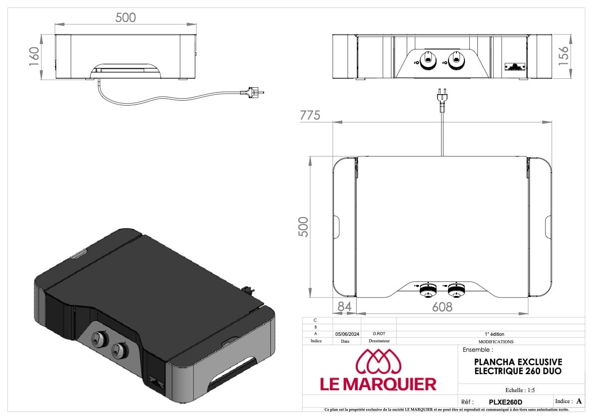 Il robusto design, realizzato in acciaio elettrozincato abbinato a inox 304 opaco, si completa con un raccoglitore inox rettangolare nascosto in facciata (capacità 1,2 L) per una facile evacuazione dei liquidi. Funziona a 220V ed è conforme alle normative CE, IPX4 e al Label OFG (Certificazione Origine Francia Garantita). Con dimensioni di L78 x P49 x H16 e un peso di 34 kg, la Piastra Exclusive Elettrica 260 Duo è pensata per integrarsi in ogni ambiente, offrendo due zone di riscaldamento indipendenti per cadenzare le cotture in modo impeccabile.
