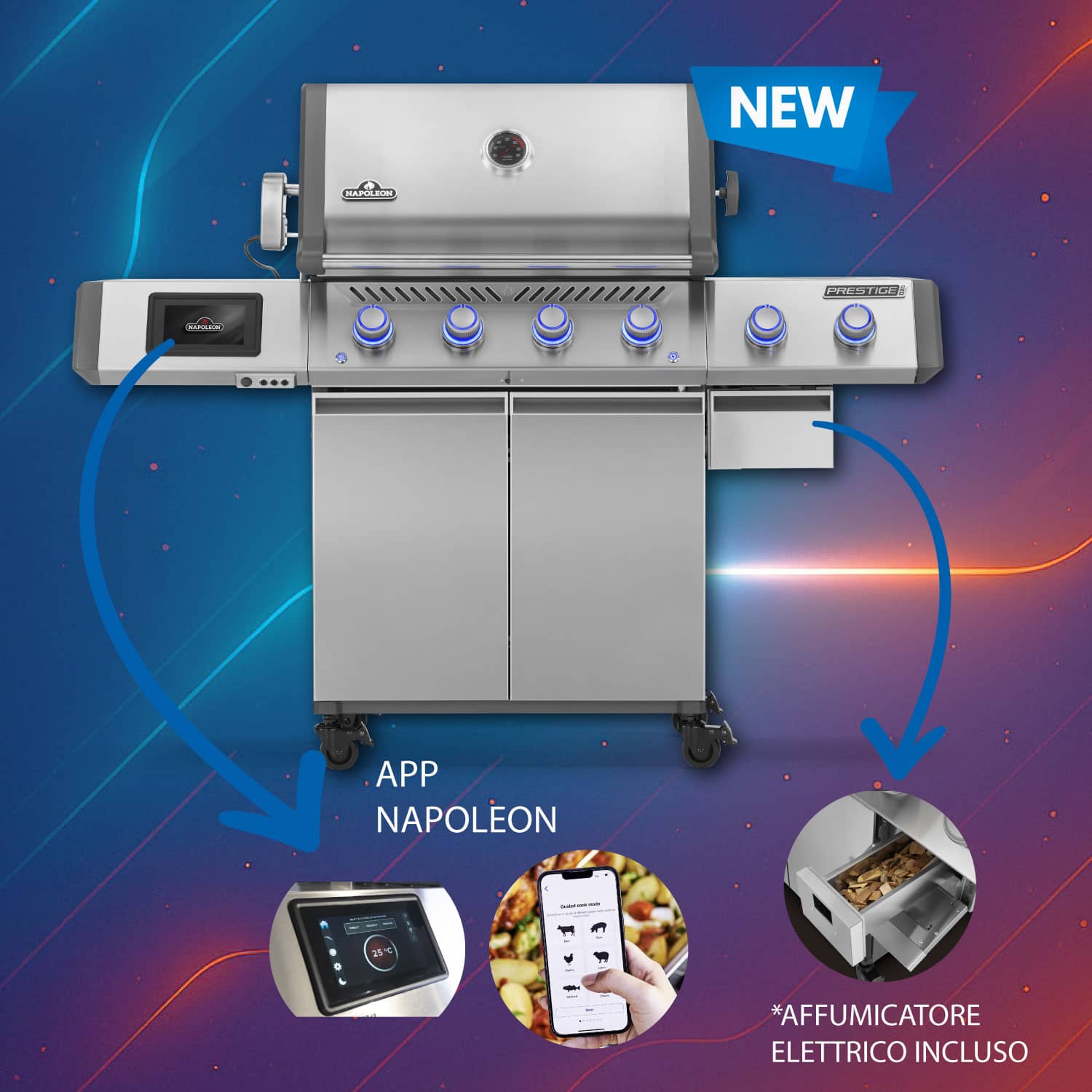Attraverso la Napoleon Home App, puoi monitorare le temperature in tempo reale, impostare timer, ricevere assistenza alla cottura e avvisi di alta temperatura direttamente dal tuo smartphone. Il Napoleon Prestige 500 Connected RSIBinclude sonde termometriche di precisione e un display LCD integrato, garantendoti il controllo totale su tutto ciò che accade all’interno del tuo grill.