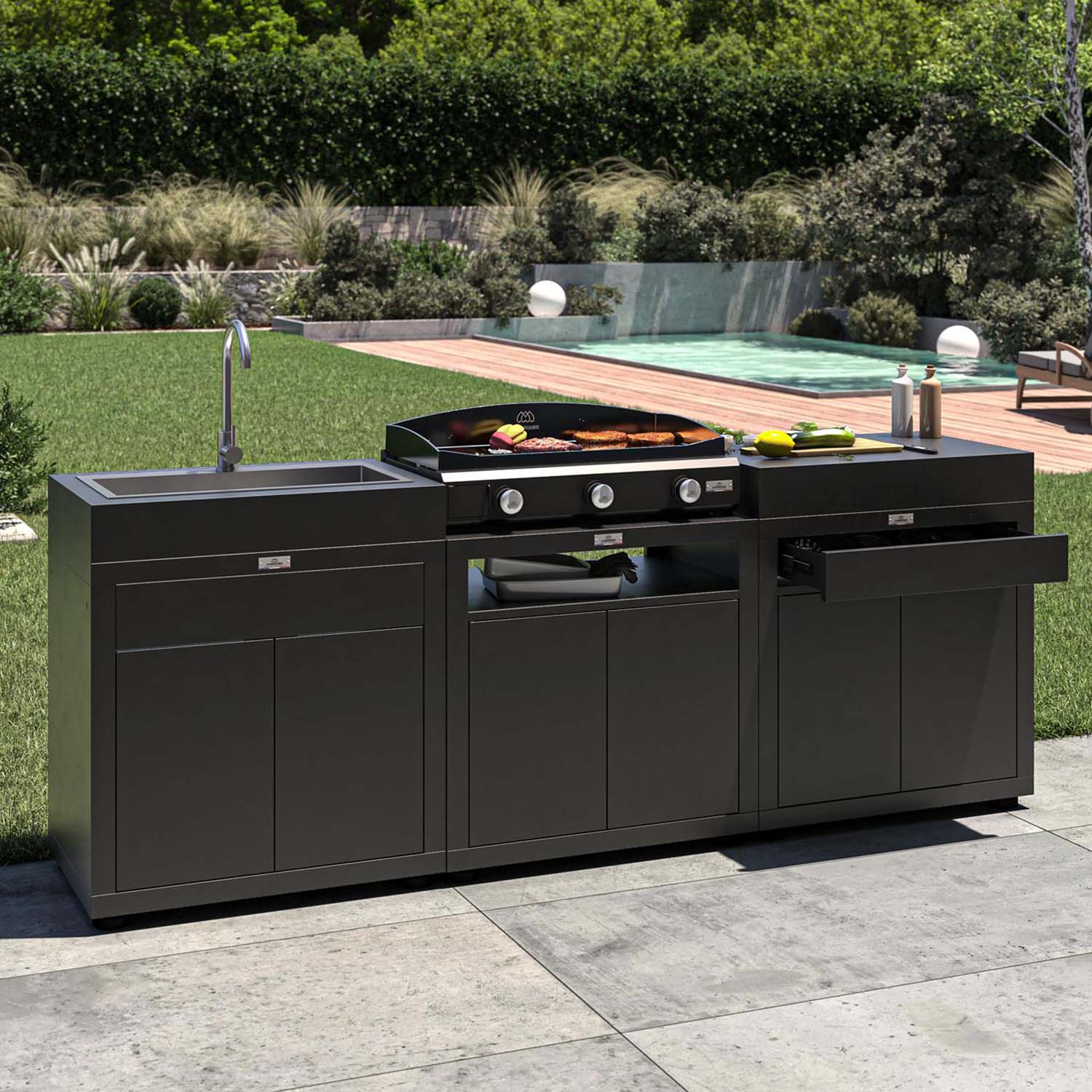 Un altro elemento utile è la vaschetta raccogli-gocce in acciaio inox da 750 ml con uscita frontale, una soluzione che migliora la praticità durante e dopo la preparazione dei cibi. Questo accorgimento aiuta a mantenere più ordinata la zona di cottura e rende la pulizia più agevole, aspetto importante per chi utilizza la plancha con regolarità. La finitura nera del telaio in acciaio elettrozincato rafforza inoltre l’aspetto moderno e discreto del prodotto, rendendolo facile da inserire in ambienti outdoor dallo stile sia contemporaneo sia essenziale.